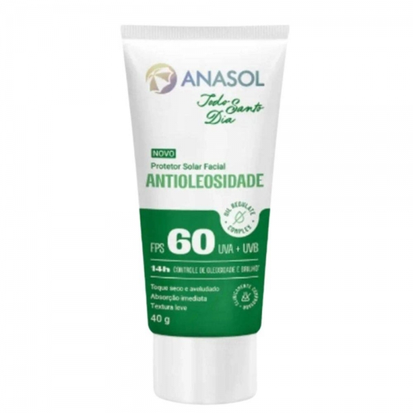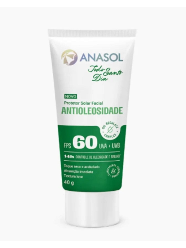 O Protetor Solar Facial Antioleosidade FPS 60 da linha Anasol Todo Santo Dia é a escolha ideal para quem busca proteção intensa contra os raios UVA e UVB sem abrir mão do conforto. Com ação hidratante e antioxidante, sua fórmula exclusiva garante até 14 horas de controle de oleosidade e brilho, mantendo a pele sequinha e com toque aveludado durante todo o dia. Desenvolvido para todos os tipos de pele que sofrem com excesso de oleosidade, oferece absorção imediata e textura leve, proporcionando uma sensação de frescor e leveza logo na aplicação. Dermatologicamente testado, cruelty free e vegano, é perfeito para quem quer proteger e cuidar da pele de forma consciente.