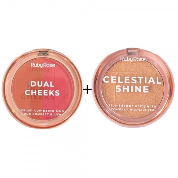 Deixe sua make ainda mais iluminada e cheia de vida com o Combo Ruby Rose, que combina o Blush Compacto Dual Cheeks nas cores 3 e 4 com o Iluminador Celestial Shine Prism Light.