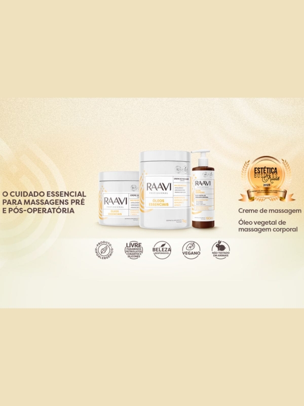 O Raavi Creme de Massagem Óleos Essenciais é um creme corporal de alta performance, desenvolvido especialmente para profissionais da área estética e para quem busca um cuidado intensivo com o corpo. Sua fórmula exclusiva, rica em óleos essenciais naturais, promove hidratação profunda, bem-estar e equilíbrio da pele, sendo ideal para procedimentos de massagem pré e pós-operatória, drenagem linfática, e outros tratamentos corporais voltados à recuperação e relaxamento.