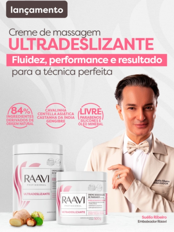 - Textura leve e toque seco: Diferente de muitos cremes no mercado, o Ultradeslizante da Raavi não deixa a pele oleosa ou pegajosa, facilitando a finalização do procedimento e elevando a experiência sensorial da sessão.