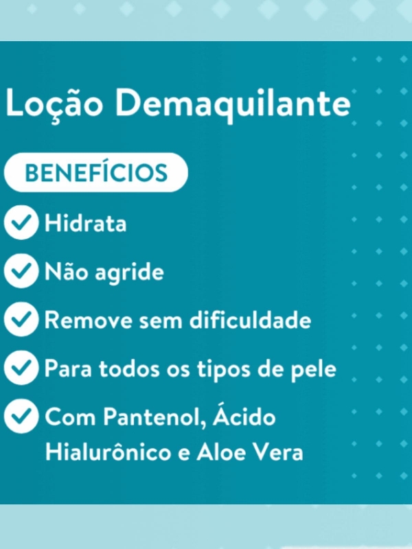 Livre de óleo e a base de água, a Loção Demaquilante remove a maquiagem do dia a dia sem agredir a pele, evitando o ressecamento, preservando, diminuindo flacidez, linhas e sinais de expressão.