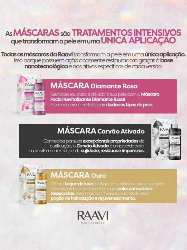 Informações do produto: Máscaras Faciais Revitaliza Rejuvenesce Purifica Raavi - DIAMANTE ROSA