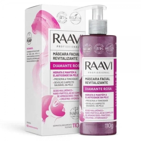 Máscara Facial Revitalizante Diamante Rosa Raavi 110g, enriquecida com ativos poderosos para uma pele radiante e rejuvenescida.