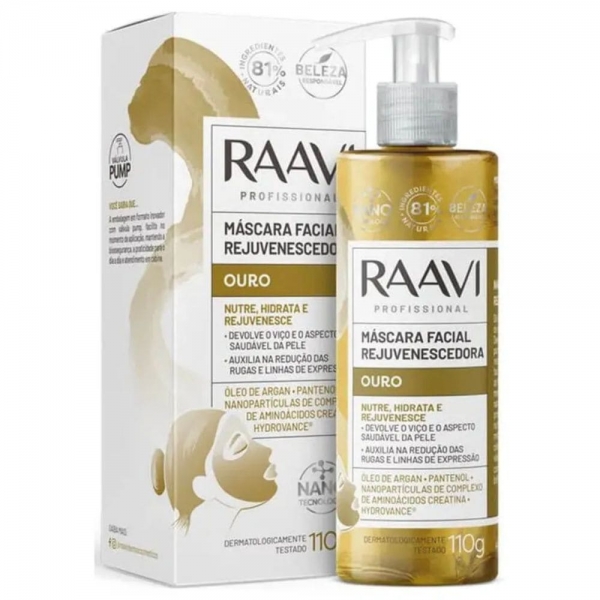 Sinta o poder do ouro em sua pele e transforme sua rotina de cuidados faciais com a Máscara Facial Rejuvenescedora Ouro Raavi.