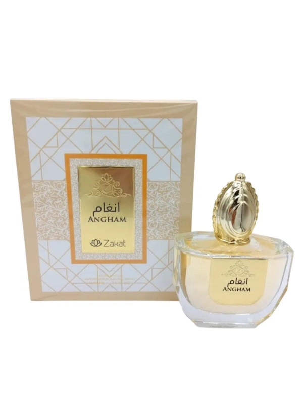 Angham Zakat da Lattafa é um Eau de Parfum feminino que exala sofisticação e doçura moderna.