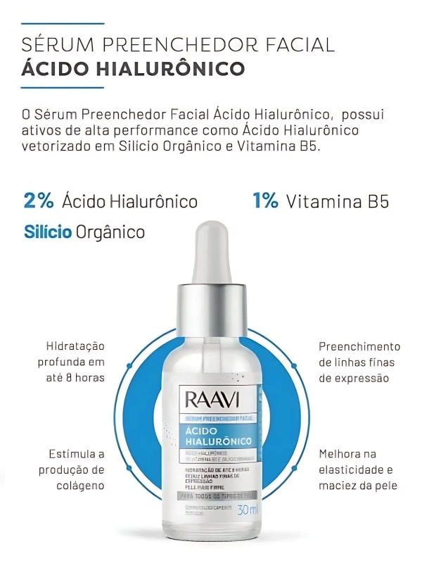 Informações do produto: Sérum Preenchedor Facial Ácido Hialurônico Raavi 30ml